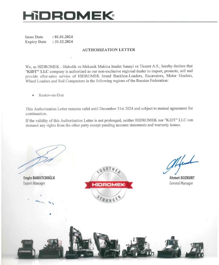 ООО «КиДТ» - официальный дилер производителя дорожно-строительной техники Hidromek. Все поставляемые нами машины обеспечиваются сертифицированным сервисным обслуживанием, запчастями и комплектующими.